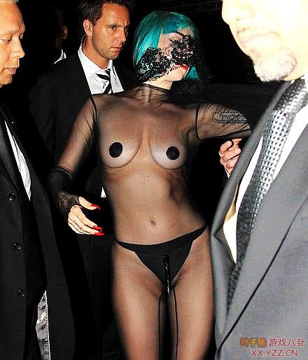 LadyGaga穿着黑色透视紧身装现身,上身两点贴圆胶布遮住,下身仅着一条内裤,十分火辣。